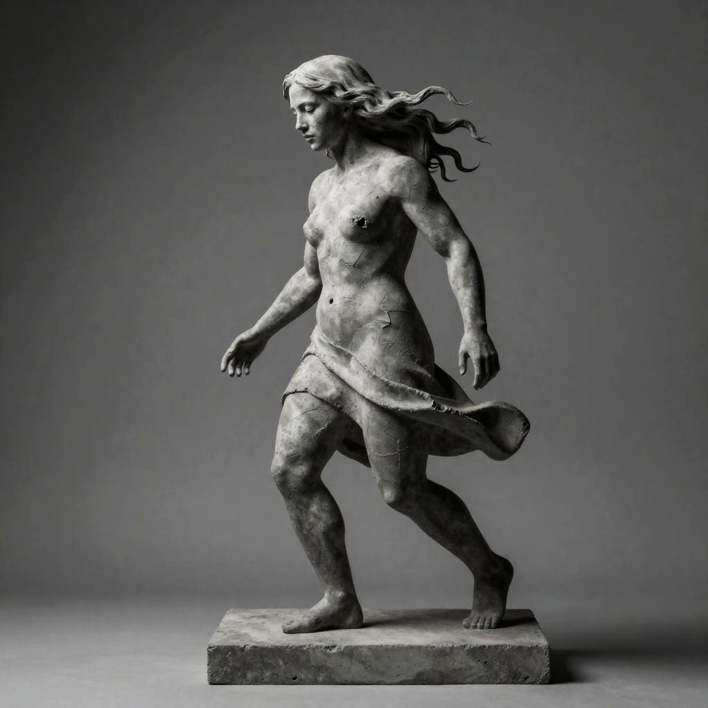 Realistic photo.(charcoal) of a woman with long hair and scuffed texture, dynamic action, minimalist features, (surrealist sculpture), ash grey background, (concrete art), atmospheric and introspective mood that conveys emotion in its imperfections, (ultra-detailed), (high quality) with striking textures and depth, ideal for an impressive display of artistry. realistic photo