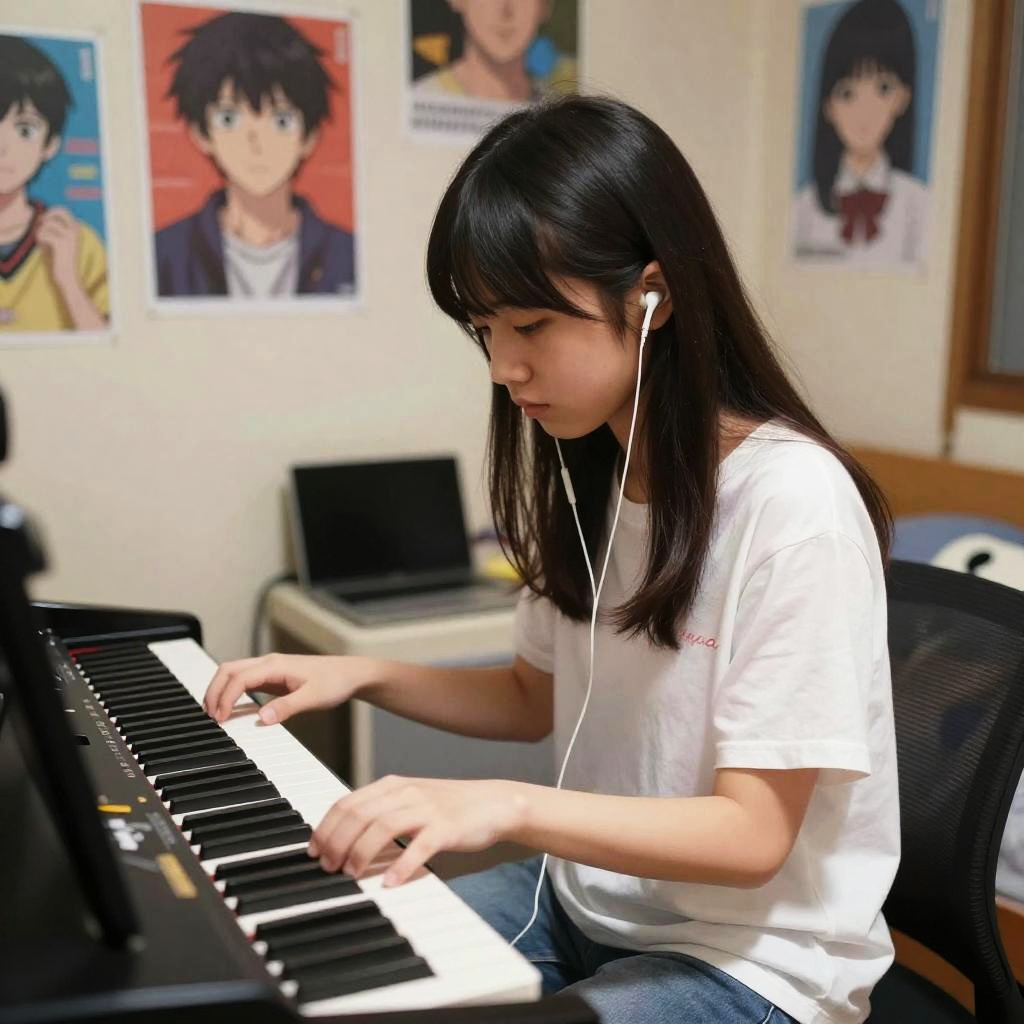Realistic photo.a shy musician, with long hair and earphones, working on composing a song, in a small bedroom decorated with posters, depicted in the humorous and wholesome anime style of Izumi Tomoki. realistic photo