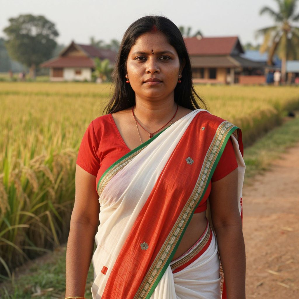 A realistic and authentic image of a woman in her 40s with straight black hair, neutral face, and calm expression, wearing a traditional tiranga saree with vibrant red, white, and green borders, standing in a rural village in Odisha, surrounded by paddy fields and traditional homes under golden afternoon sunlight.. The woman has big tits and cute face