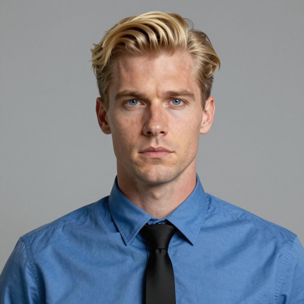 Funny breathalyzer costume, photograph of a serious-looking man with brown hair and beard, wearing a light blue dress shirt and dark tie, standing against a gray background, with a device mounted on his chest, device has a small red light and gray and blue colors, man's hands in pockets, professional attire, studio lighting, realistic style