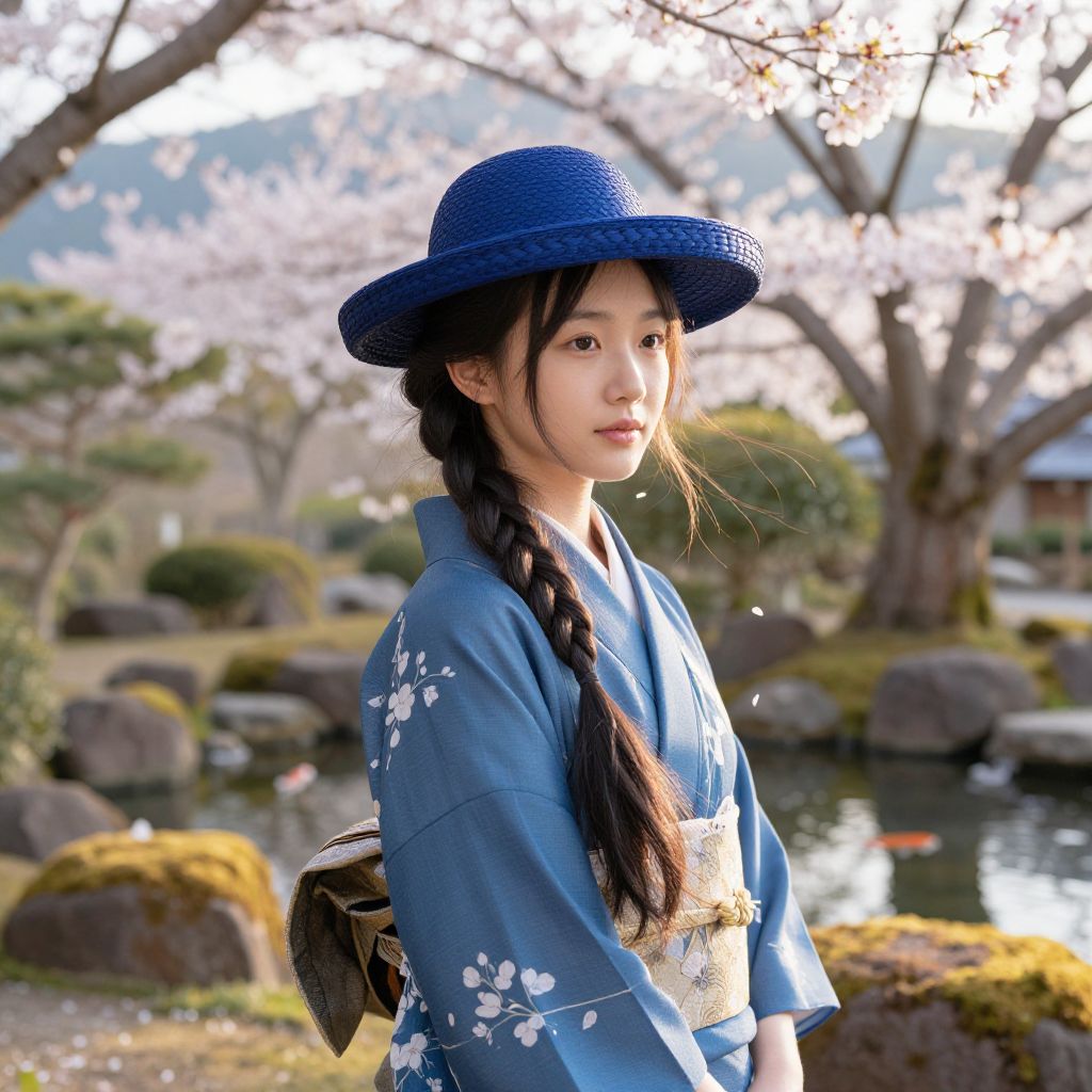 An Asian girl with long, flowing braids that cascade down her back, her skin softly glowing under the natural light, wearing a traditional blue kimono with delicate floral patterns and a matching blue woven hat that sits neatly on her head. Her eyes are gentle and reflective, exuding calm and quiet strength. She stands gracefully in a serene outdoor setting, surrounded by soft sunlight filtering through a canopy of blooming cherry blossoms, the wind gently rustling the petals and her braids. The background features a tranquil Japanese-style garden with moss-covered stones, a small koi pond, and distant mountains, all bathed in a peaceful, golden-hued morning light. The overall atmosphere is one of harmony, elegance, and natural beauty, capturing a moment of stillness and inner peace.