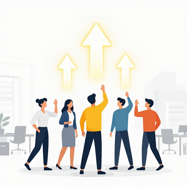 Team members collaboratively moving forward with glowing arrows overhead symbolizing initiative and progress, modern office background, clean and minimalistic digital illustration with bright and inspiring colors