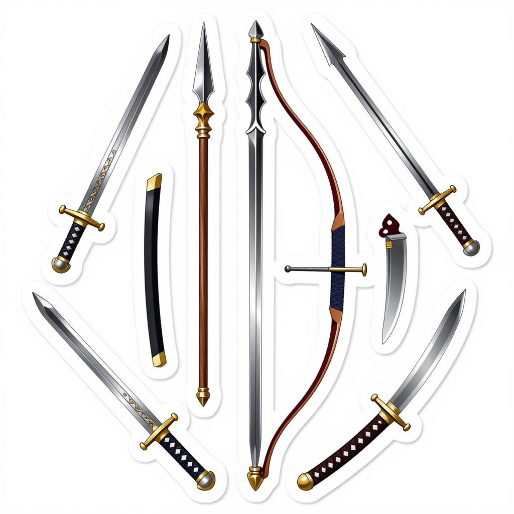 Vivid hand to hand combat weapons: Create a sticker featuring various weapons like swords, short and long bows, and spears, katanas, knives, samuri swords, arranged in an aesthetically pleasing way. Using the differing metalic tones of silver and other appropriate colors but there is a slight variation is hues,