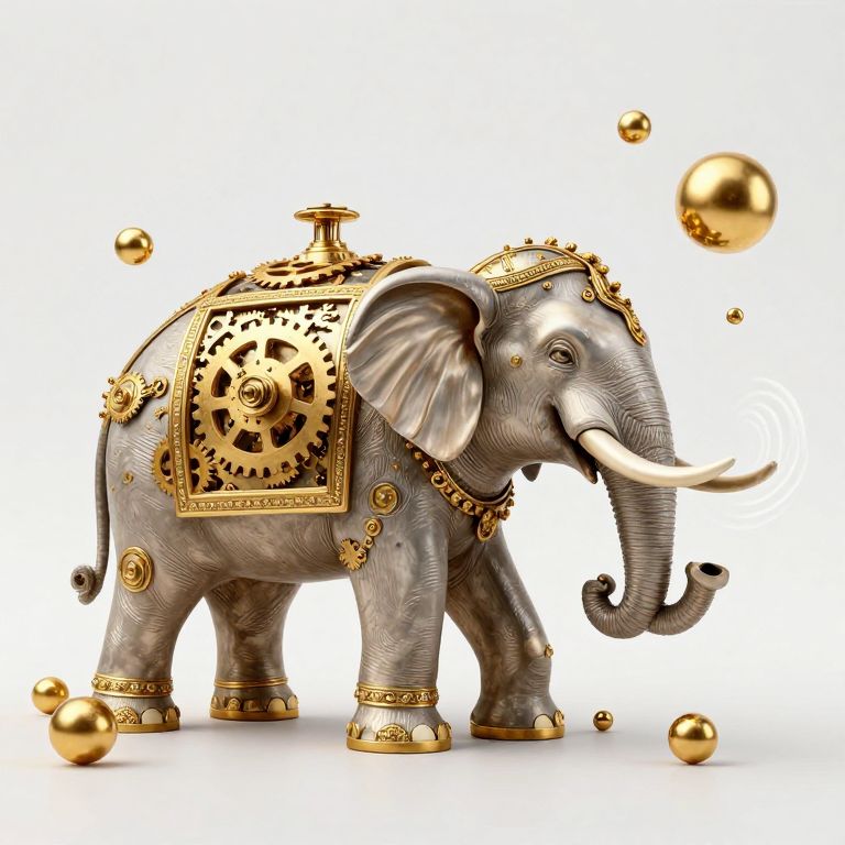 Digital illustration of an ornate, silver elephant adorned with gold gears, chains, and spheres, standing on white background with floating gold balls.