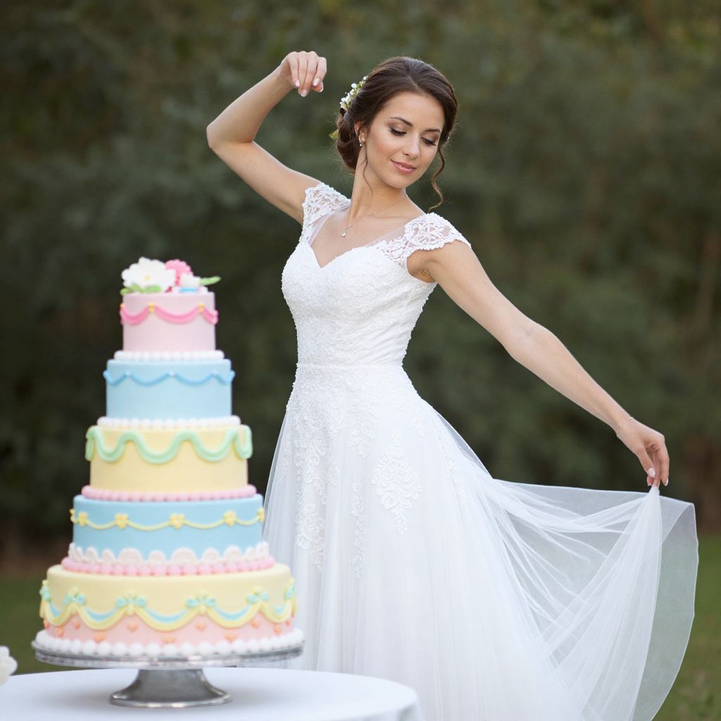 An ethereal blend of serenity and celebration, where the timeless elegance of a bride's poised grace meets the vibrant whimsy of a pastel-hued cake, symbolizing the delicate dance between tradition and joyous renewal.