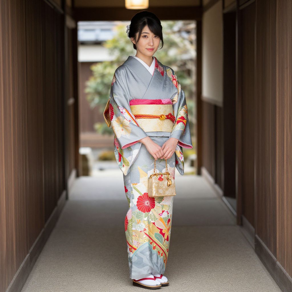 Kimono Japanese Costume, woman in traditional japanese dress standing in a hallway