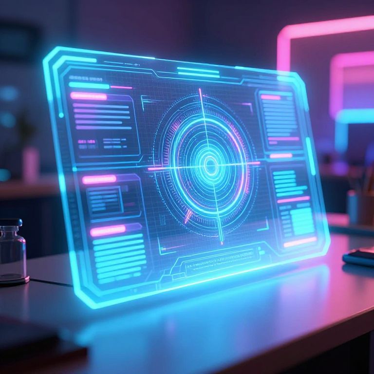 Neon-lit, futuristic display screen with blue and pink holographic interface, featuring a central target circle, on a dimly lit desk.