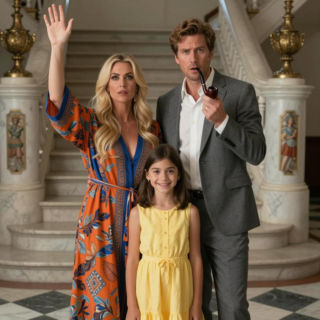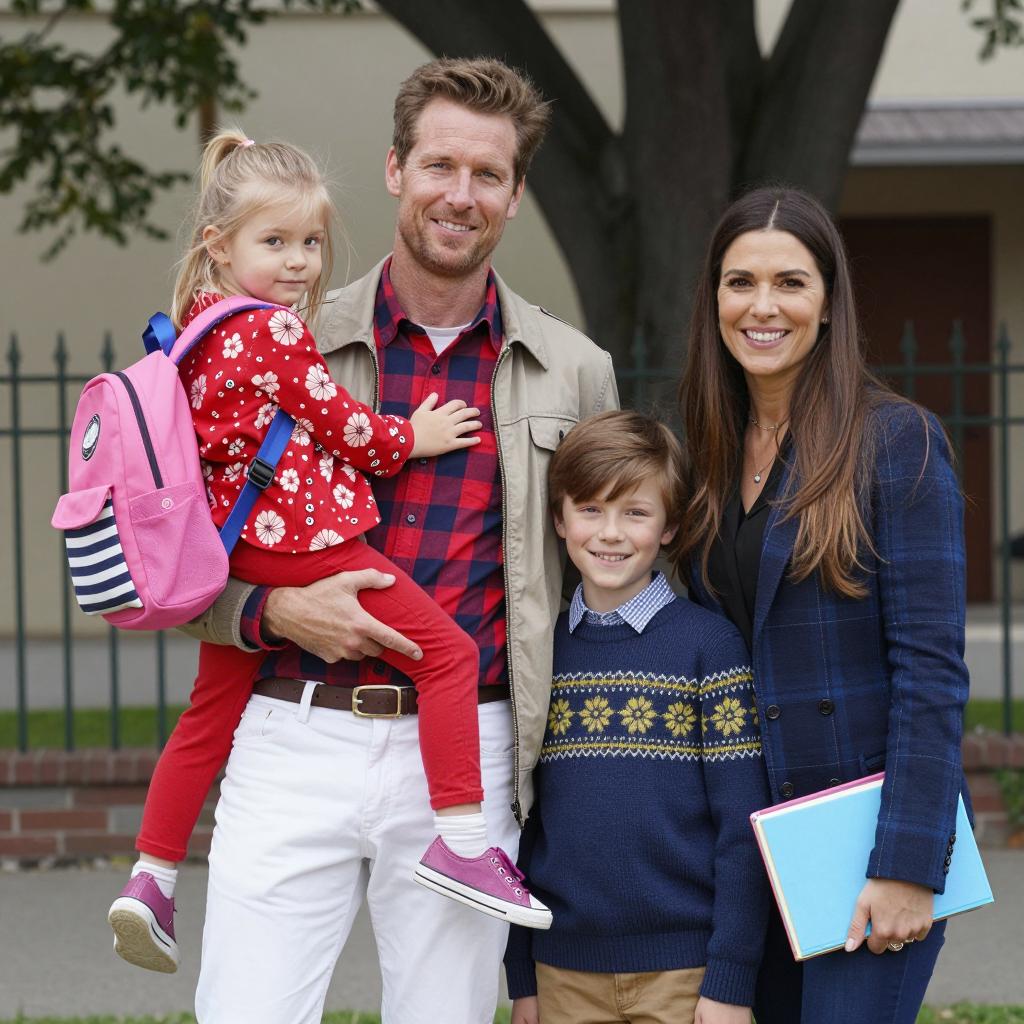 Family group photo. Man with brown hair, red plaid shirt, beige jacket, white pants, holding young girl in red floral top, red pants, striped backpack. Boy in blue sweater with yellow patterns, brown hair, smiling. Woman with long brown hair, blue plaid jacket, carrying books, smiling. Background: tree, building, metal fence. Casual outdoor setting.