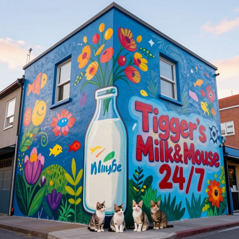 Vibrant cityscape shot frames the imposing structures facade, covered in colorful murals of blooming bottles with milk, small colorful fishes, and whimsical depictions of nature, Amidst this urban canvas, a three playful cute kitten's sits calmly against the wall, looking at surrounded by the bold words 'Tigger's Milk&Mouse 24/7' in graffiti font, as if appreciating the artistic expression, colorful, evening