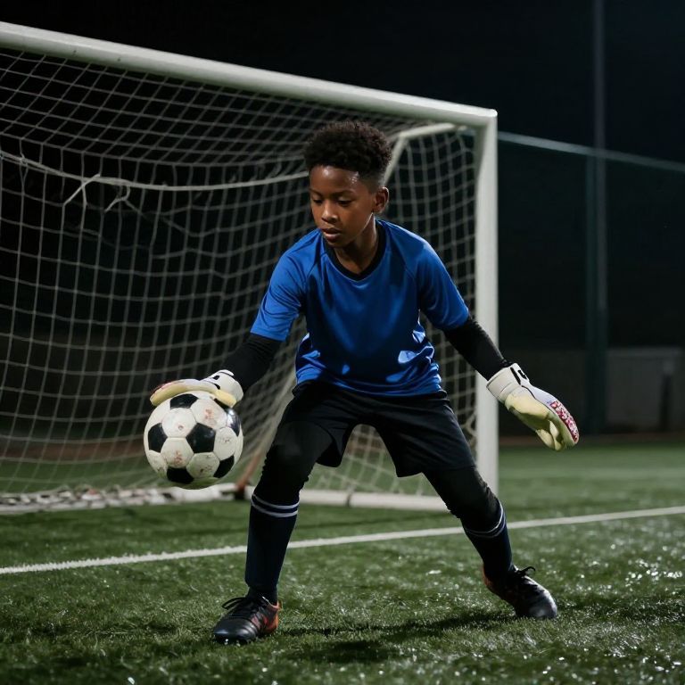 Thought 10 year old light skinned african american boy playing goalie in a competitive soccer match, cinematic, photorealistic, dramatic, wideshot, ar 16:9,
