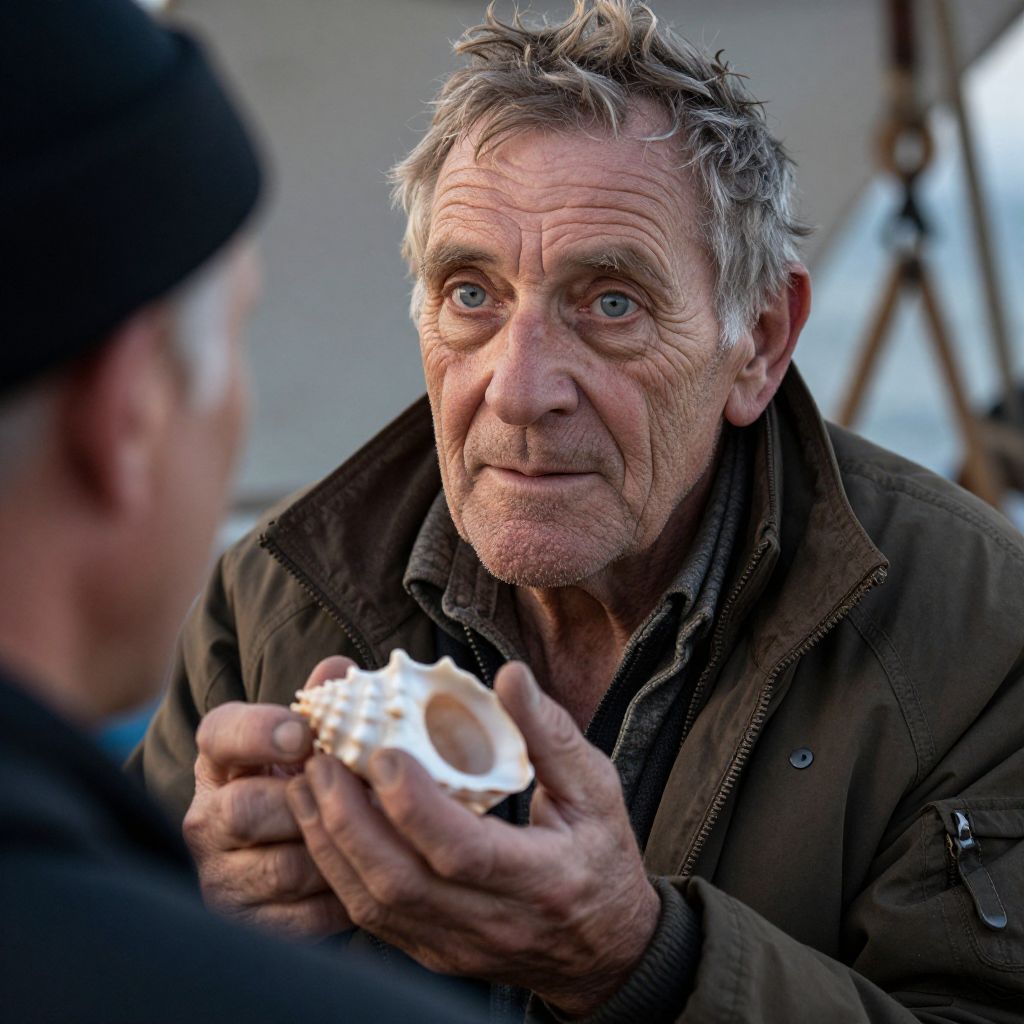 A photorealistic portrait captures a gnarled fisherman from an 'over-the-shoulder' perspective, showcasing his rugged features, sun-worn skin, and hazy blue eyes filled with tales of the sea. In the soft lamplight, his wrinkled hands gently cradle a delicate seashell, symbolizing his deep connection to the ocean's mysteries. The image combines classical realism with an emotional depth, highlighting both the strength and vulnerability in this Celtic man's visage. Rendered with meticulous detail and nuanced textures, it invites viewers into the soulful world of this wise mariner.