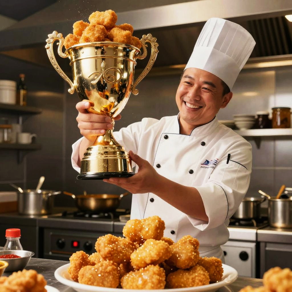 Chicken nugget trophy held triumphantly by a smiling chef, golden crispy surface, vibrant restaurant kitchen scene, dynamic lighting highlighting texture and gloss