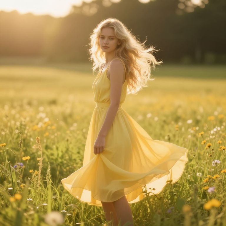 Blonde in yellow dress standing in a sunlit meadow surrounded by wildflowers, soft breeze ruffling the dress, warm golden hour lighting, dreamy and serene atmosphere