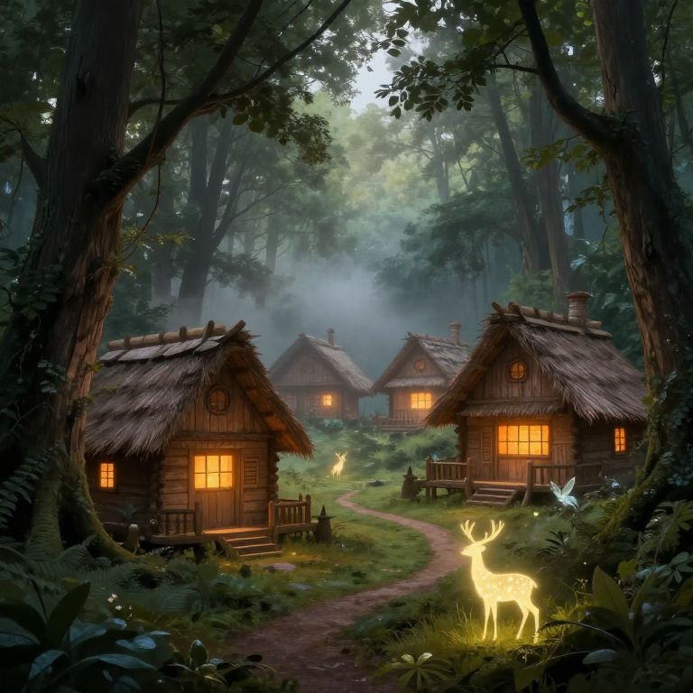 A digital painting depicts a mystical forest scene at twilight. Two wooden, thatched-roof cottages with warm, yellow-lit windows are nestled among tall, dense trees. A winding dirt path leads through the forest, flanked by lush greenery. In the foreground, a glowing, ethereal white deer stands on the path. Mist gently rises around the cottages, adding a dreamlike quality. The forest is rich with varying shades of green and dark, towering tree trunks frame the scene, creating a sense of depth and enchantment. The overall mood is magical and serene.