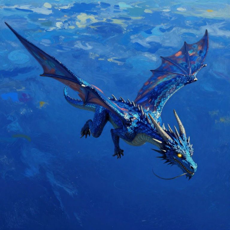 Envision an awe-inspiring digital artwork portraying a magnificent dragon gliding gracefully through a sky painted in richly saturated colors reminiscent of the Blue Period style. The dragon, its eyes gleaming with an otherworldly golden light, traverses the expansive expanse from an unconventional aerial viewpoint. This captivating scene artfully intertwines elements of fantasy and emotion, encapsulating the creature's profound solitude amidst the vibrant blue tones that seem to dance upon its iridescent scales. The harmonious blend of colors and perspectives evokes a powerful emotional spectrum within the observer, instilling both reverence and melancholy.