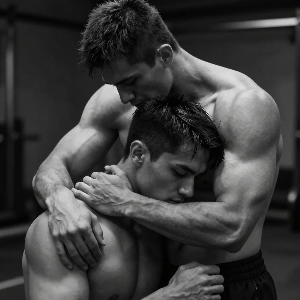 This is a dramatic, black-and-white photograph of two shirtless, muscular men in an intense, passionate embrace. The man in the back has short, spiky hair and is gripping the chest of the man in front, who has dark, slicked-back hair. The lighting is low and moody, creating strong shadows that highlight their defined muscles. The camera angle is slightly low and front-facing, with a shallow depth of field that keeps the background blurred, focusing attention on the two men.