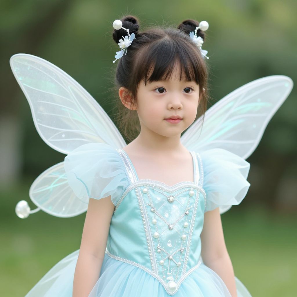 Photograph of an adorable Asian girl with black hair in buns, wearing a light blue fairy dress with white wings, standing in a green, blurred