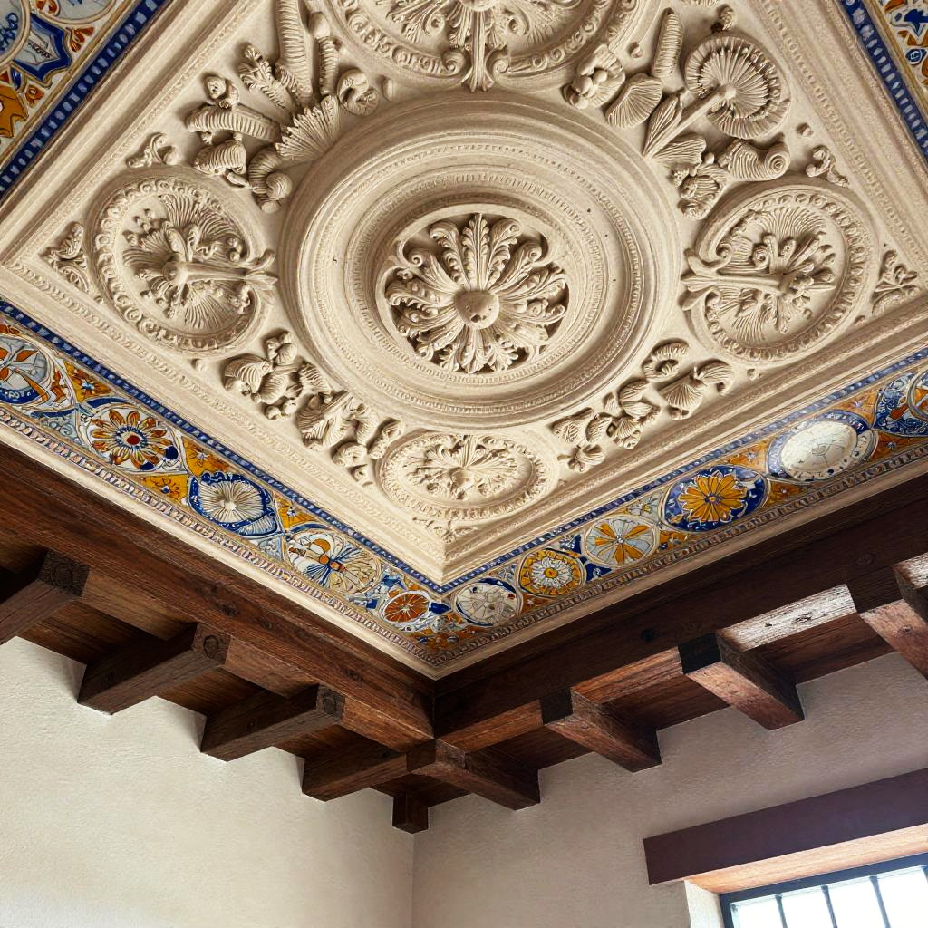 Spanish ceiling design displaying elaborate stucco reliefs, bold colorful ceramics, exposed beam construction with rustic finishes, historic colonial style with rich textures, natural sunlight