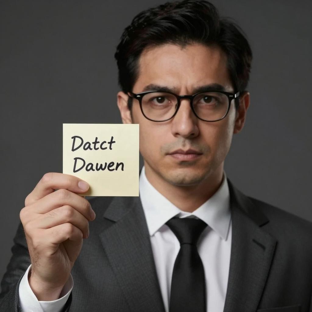 Photograph of a man with dark hair, glasses, and a serious expression, holding a handwritten note in his right hand. He wears a dark suit with a white shirt and black tie. Background is dark and indistinct. Note is yellow and handwritten in black ink. Man is centered in the frame.