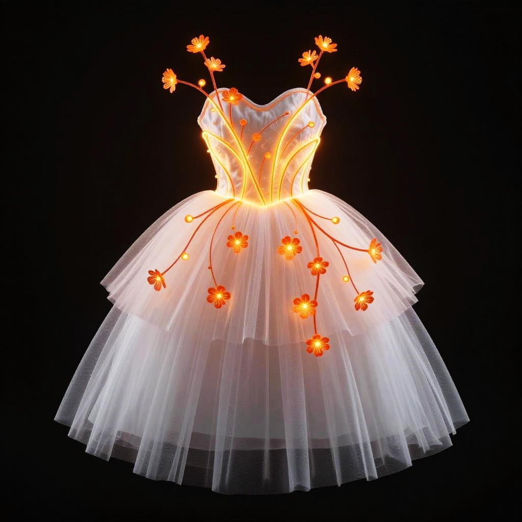 This image is a CGI illustration of a futuristic, glowing dress with a white, layered tulle skirt and intricate, neon orange wire-like patterns on the bodice. The design features delicate, branching orange accents that resemble small flowers. The background is a solid black, making the bright colors and textures of the dress pop. The overall style is whimsical and ethereal.