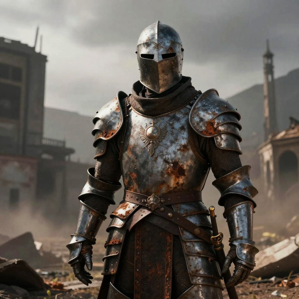Rusty noble in a post-apocalyptic setting, armored in dented and decayed regal gear, with a desolate cityscape behind, gritty texture, cinematic lighting, foreboding mood
