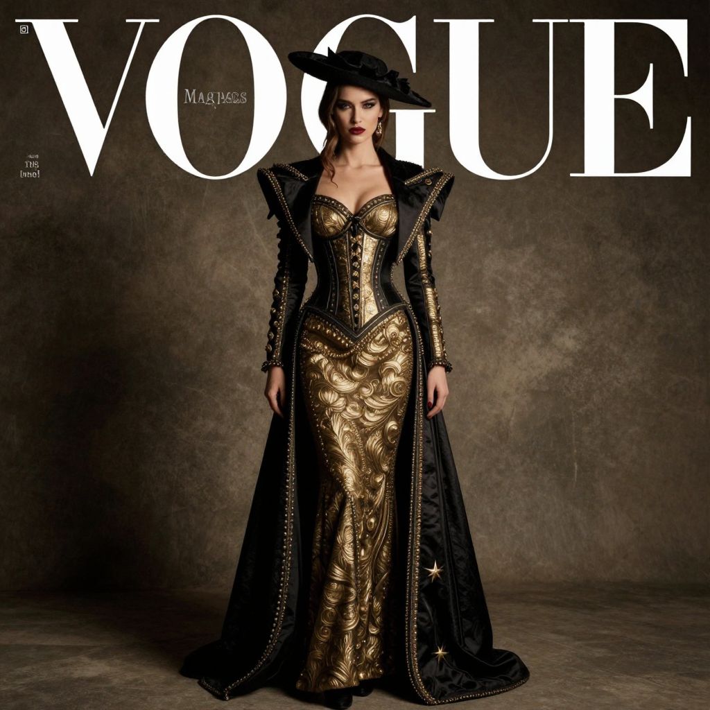 Photograph of a slender woman with pale skin and dark hair, wearing a dramatic, gold and black corset gown with intricate floral patterns. The gown features a high collar and long, black, velvet sleeves with silver studs. She has a black, wide-brimmed hat adorned with feathers. The background is a textured brown wall, and the Vogue magazine logo is prominently displayed in white at the top. The overall style is high fashion, evoking a gothic, Victorian aesthetic. The woman stands confidently, her gaze directed at the camera.