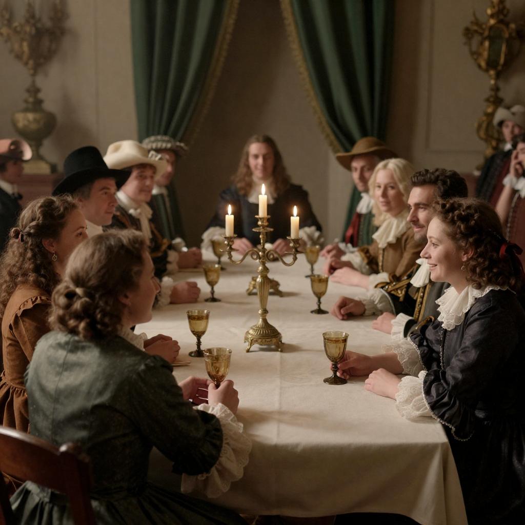 Historical photograph of a large group of people seated around a table with ornate candleholders and goblets. Men and women in 17th-century clothing with lace, ruffles, and hats. Background has green drapes and ornate wall decor. Faces show varied expressions, some smiling. Foreground and background people interact, some leaning forward. Warm, dim lighting.