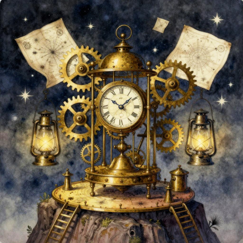 A detailed steampunk watercolor painting of an antique clockwork automaton cartographer set on a starlit cliff. The brass clock features large gears, floating star charts, and two flickering oil lanterns. The scene is set against a dark obsidian observatory background, combining metallic highlights with fine ink linework to create a nostalgic and wondrous atmosphere.