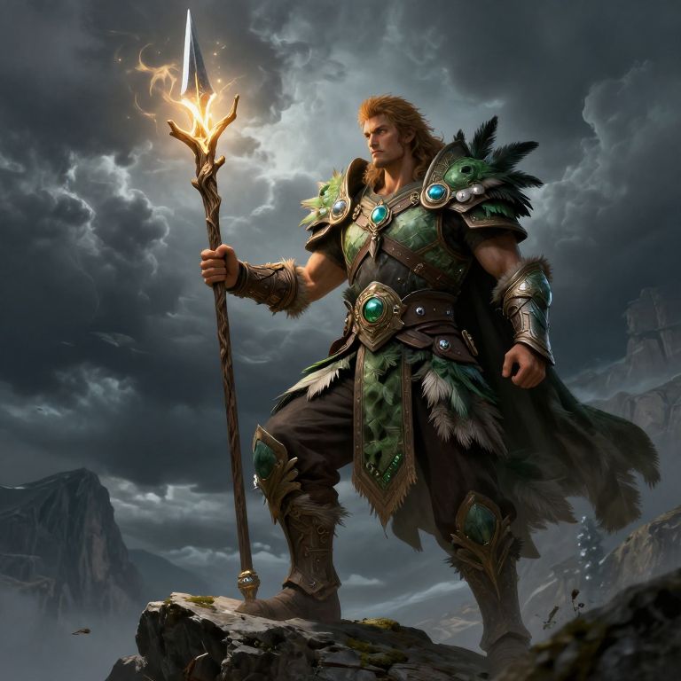 Digital artwork of a muscular, bearded warrior with green, feathered armor, holding a glowing, fiery staff, standing on a rocky cliff under a