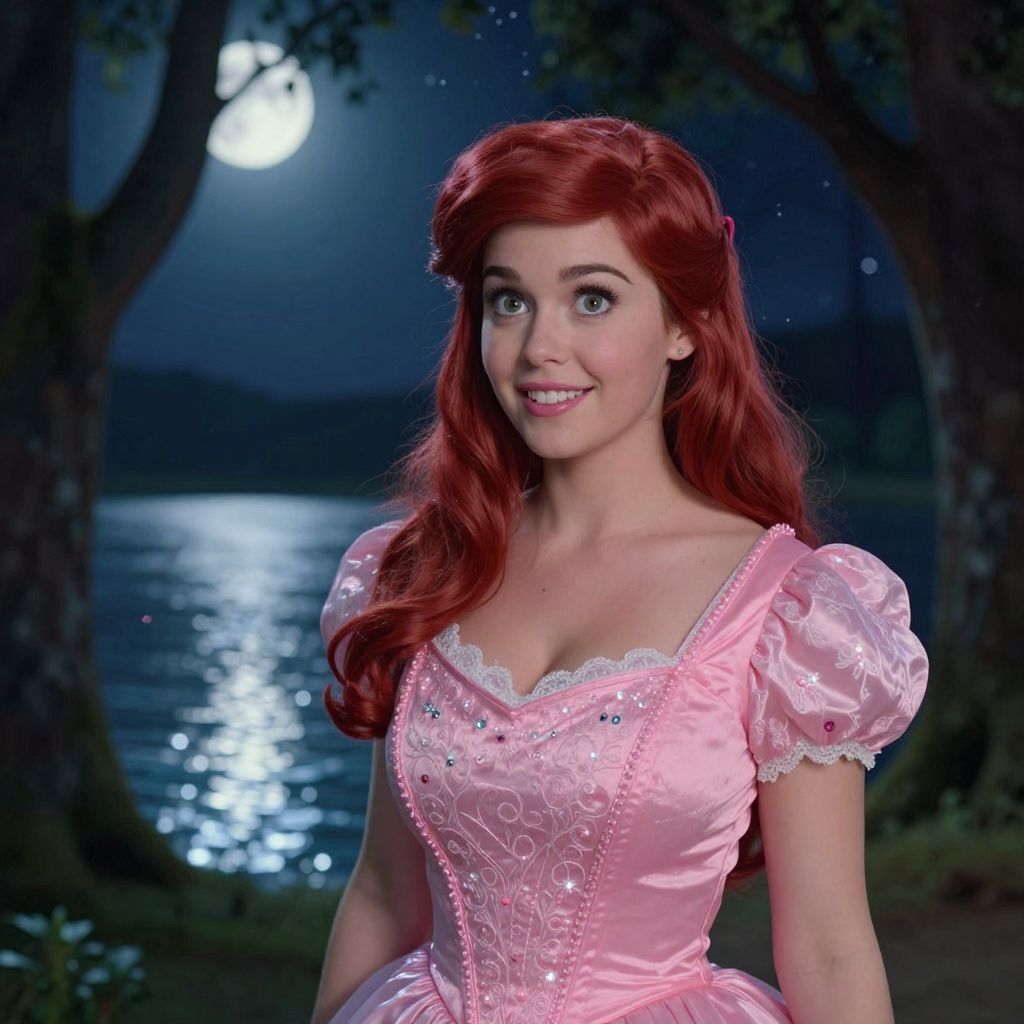 A dramatic outdoor photo of a woman in her early 20s with fair skin, large expressive eyes, and a dreamy smile dressed as Ariel in a pink dress costume, standing in a moonlit forest with glowing trees and a sparkling lake reflecting the stars, the dress detailed with lace and sparkles, soft bokeh background, cinematic atmosphere.. The woman has big tits and cute face