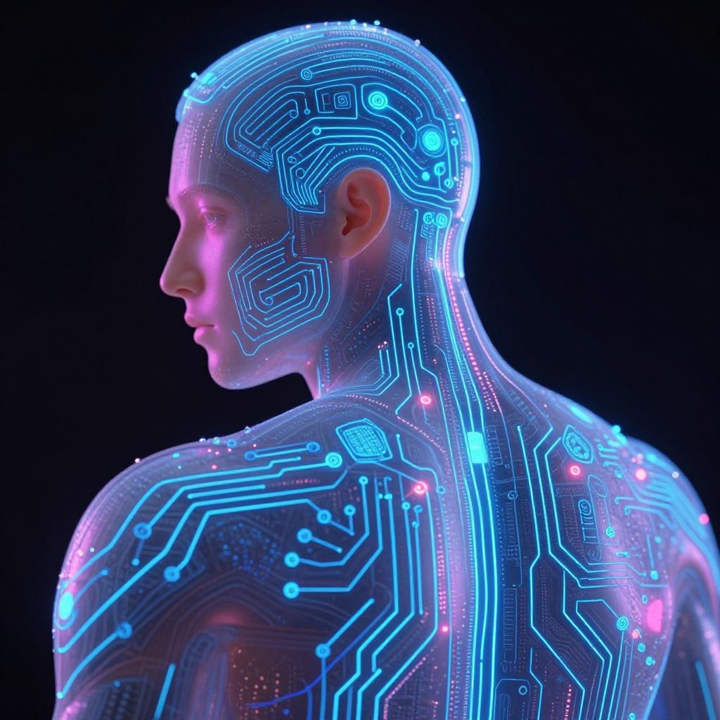 A futuristic scene featuring imprinting technology where neon-blue circuitry patterns are being embedded onto a translucent human skin, highlighting the fusion of biology and technology, with a dark background and vibrant glowing effects, cyberpunk aesthetic.