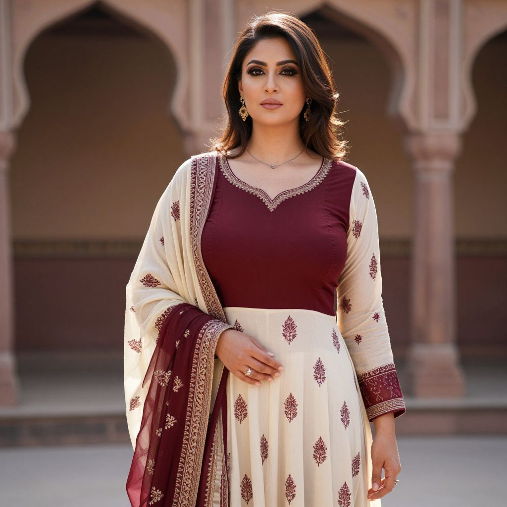 Photograph of a beautiful South Asian woman with medium skin tone, dark wavy hair, wearing a maroon and white traditional anarkali suit with