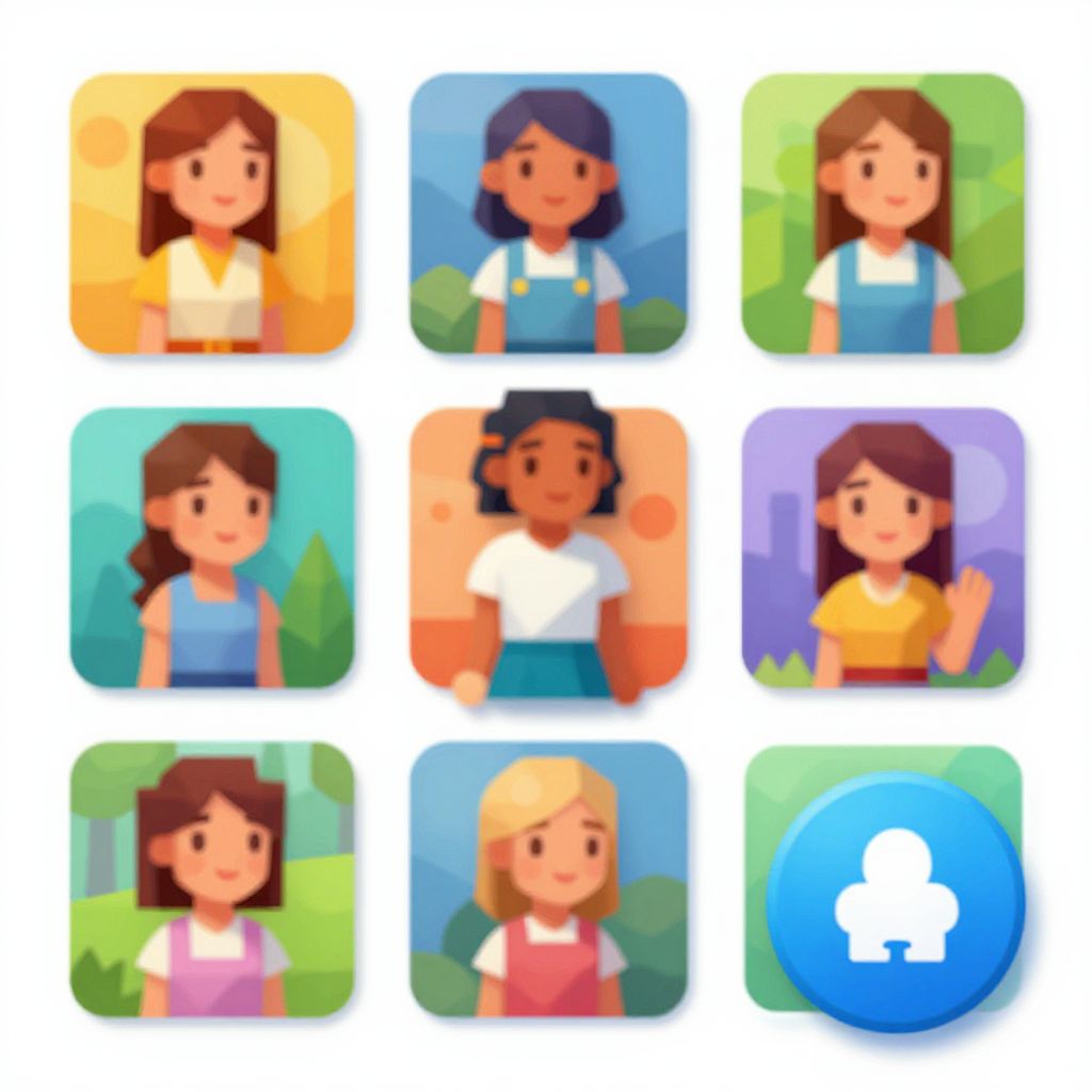 This image is a digital illustration featuring eight cartoon-style portraits of young girls, each in a rounded square with a colorful background. The girls have diverse skin tones and hair colors: brown, black, and blonde. They wear various outfits including white shirts, blue dresses, and pink aprons. The backgrounds showcase simple, bright environments like green fields and blue skies. The bottom right square contains a blue circular button with a white thumbs-up icon. The overall style is vibrant, with smooth, rounded edges and a playful, child-friendly aesthetic.