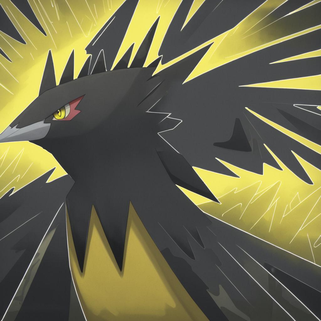 Digital artwork of a dark, bird-like Pokémon with a menacing appearance. The creature has black feathers with jagged, lightning-like edges, a sharp gray beak, and a yellow lightning bolt-shaped marking on its red eye. Its yellow chest contrasts with the dark feathers. The background is a radiant yellow with white lightning streaks, enhancing the intense, electric aura surrounding the Pokémon. The style is vibrant and dynamic, characteristic of anime and Pokémon artwork.