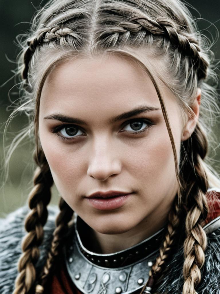 Close-up portrait of a young woman with blonde braided hair wearing a detailed Viking costume including metal and leather armor. The image captures her calm expression and intricate costume details, highlighting Norse-inspired design elements.