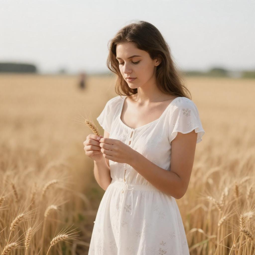 Photograph of a young woman with light brown hair, wearing a white floral dress with puffed sleeves, standing in a golden wheat field. She bends slightly forward, gently touching the wheat with her right hand. The background shows a clear blue sky and a blurred silhouette of a person on a distant path.