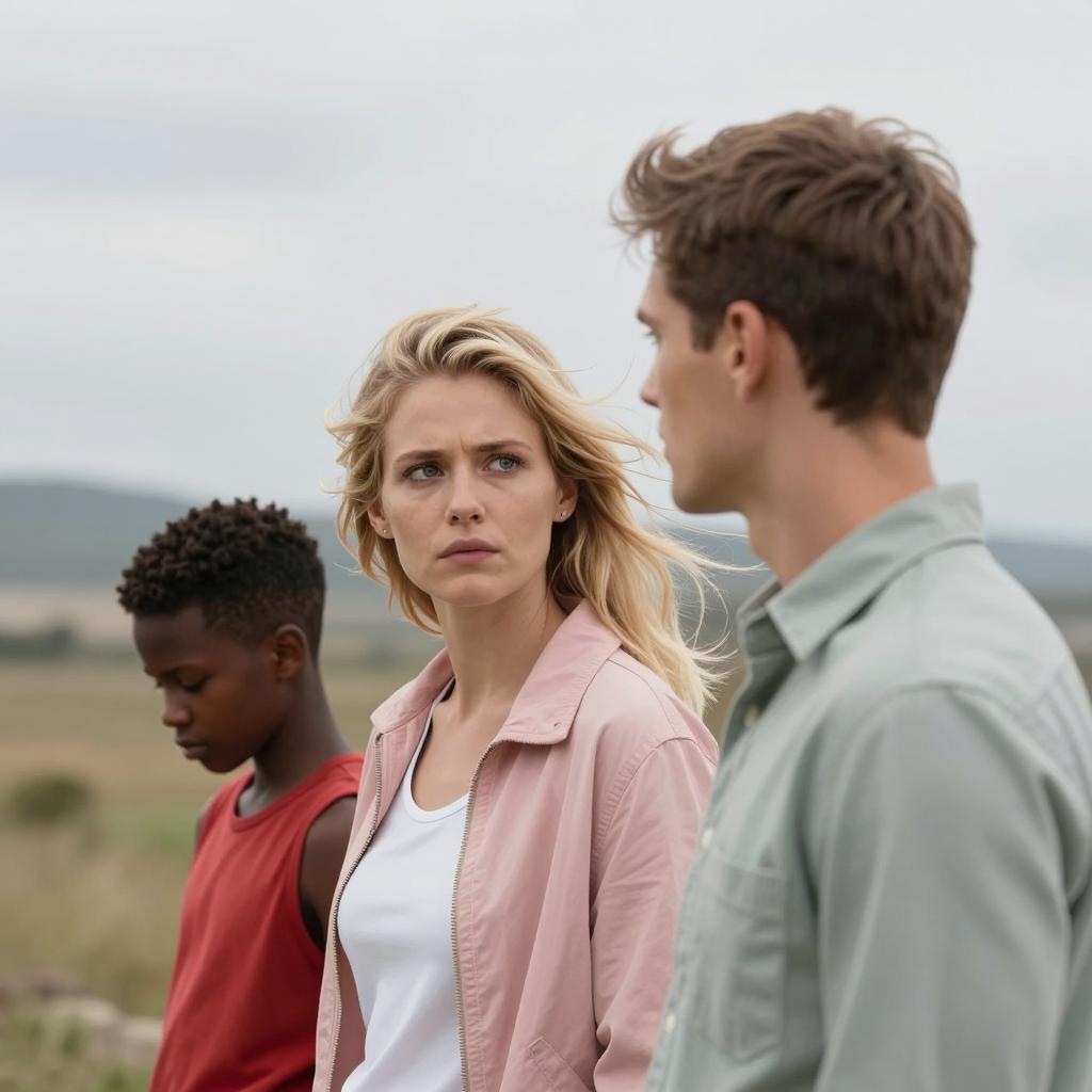 Two men sitting on a boat's deck. First man, fair-skinned, brown hair, blue eyes, wearing gray plaid shirt over red shirt, looking to the left. Second man, dark-skinned, short curly hair, wearing brown jacket over black shirt, hands clasped, looking to the right. Blue ocean, mountains in background. White metal railing behind them. Bright daylight.
