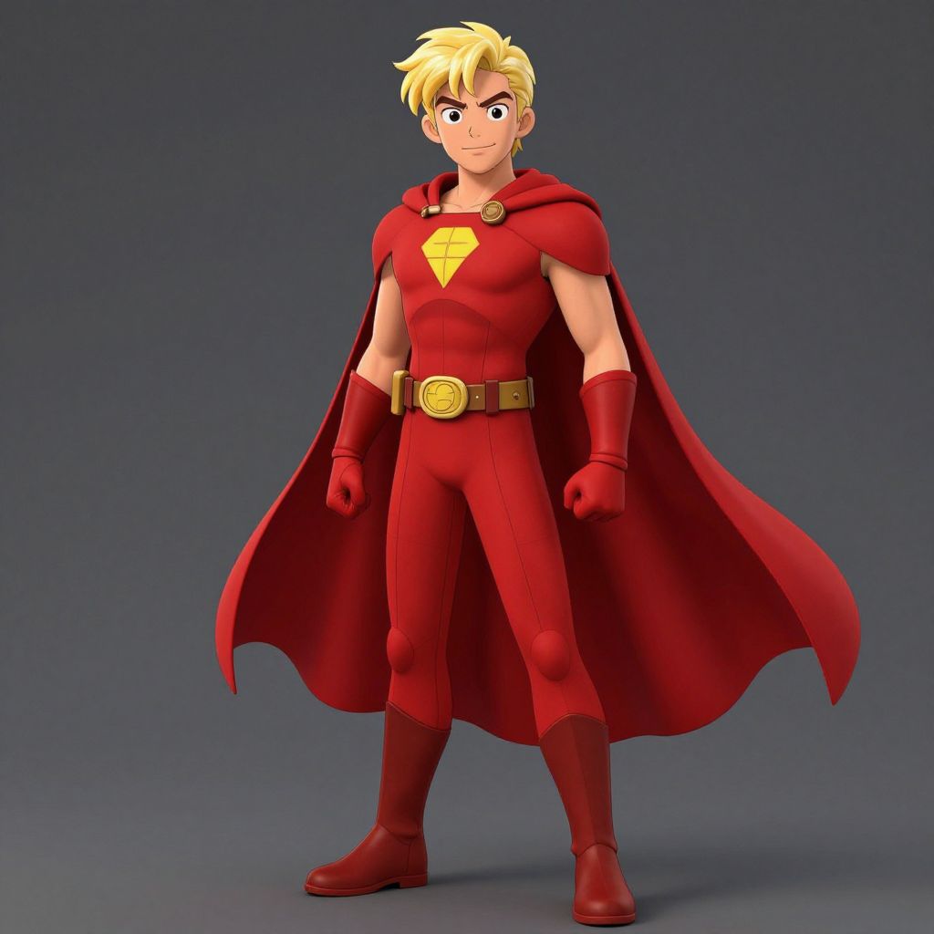 Edc inspired costume, 1boy, male focus, solo, cape, blonde hair, animification, red cape, standing, full body, belt, boots, superhero, gloves