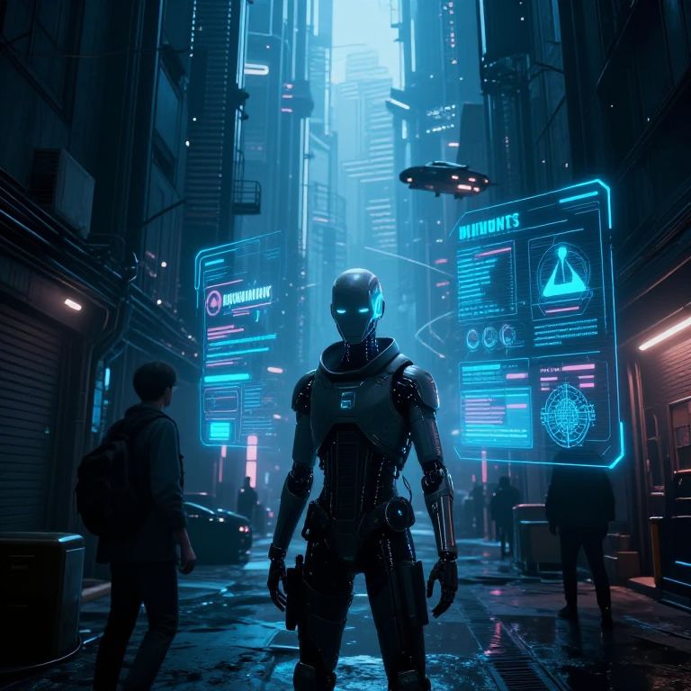 Cyberpunk writing prompts set in a dystopian future where augmented humans struggle with memory implants, glowing holographic interfaces light dingy alleyways, rogue AI agents manipulate data streams, under the watchful eyes of towering megastructures and flying cars.