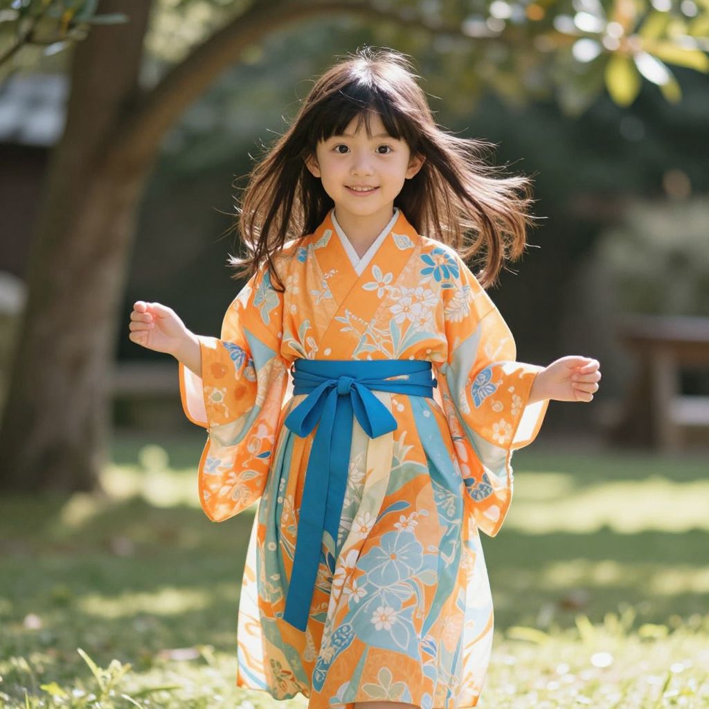 An Asian boy with short black hair, bright eyes, and a warm, playful expression, wearing a traditional brown kimono adorned with intricate red and orange floral patterns. He stands in a peaceful garden setting, sunlight filtering through the trees, with cherry blossoms gently falling around him. The scene exudes calmness and cultural charm, blending natural beauty with traditional Japanese aesthetics.