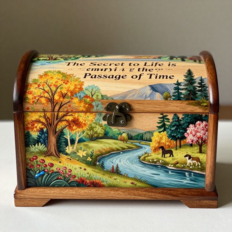 Handcrafted wooden chest featuring \"The Secret to Life is Enjoying the Passage of Time\" inscription, adorned with a vibrant four-seasons landscape motif depicting a serene natural scene with trees, flowers, a dog, and a picturesque river.
