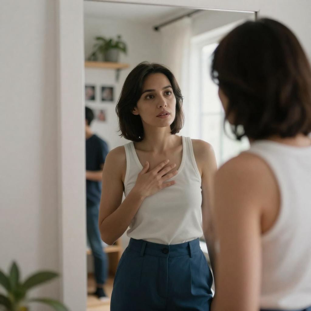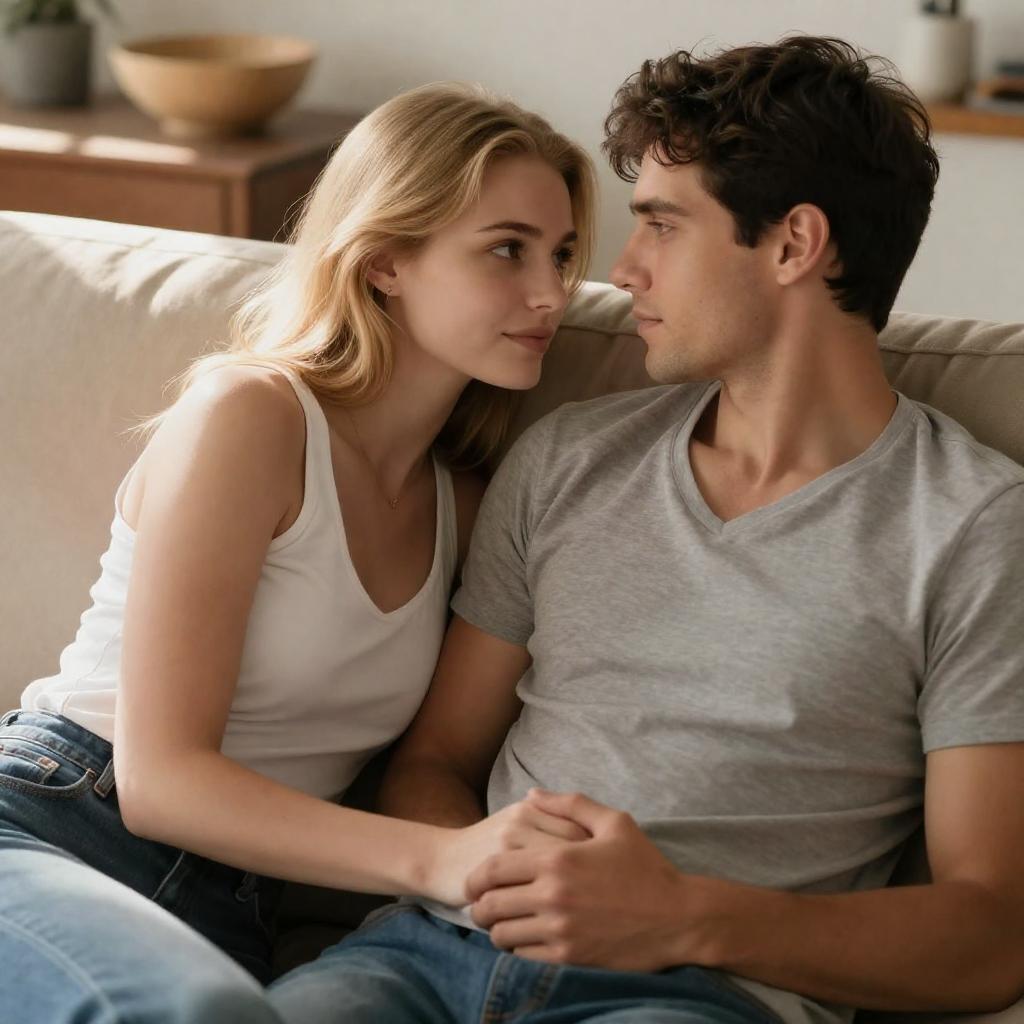 Photograph of a woman and a man in a hallway. Woman with shoulder-length brown hair, white tank top, smiling, gesturing with hands. Man with shaved head, dark jacket, standing, looking at her. Wooden staircase and green plant in background. Door slightly ajar on the right. Woman's face smiling, man's face neutral. Both standing.