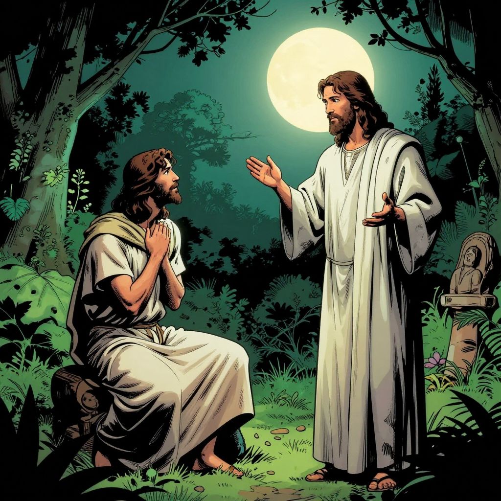 Illustration of Jesus in the Garden of Gethsemane depicted as a teacher in an enlightening, guiding moment. Rendered in contemporary graphic novel style inspired by Frank Miller, with bold lines, dramatic poses, and high-contrast lighting. The scene features a serene nighttime garden with lush greenery and a large glowing moon in the background.