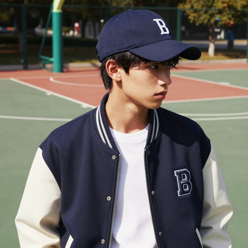 540 Waves hairstyle on teenage boy, wearing sports jacket and cap, in basketball court, captured in fashion editorial style with harsh midday sun.