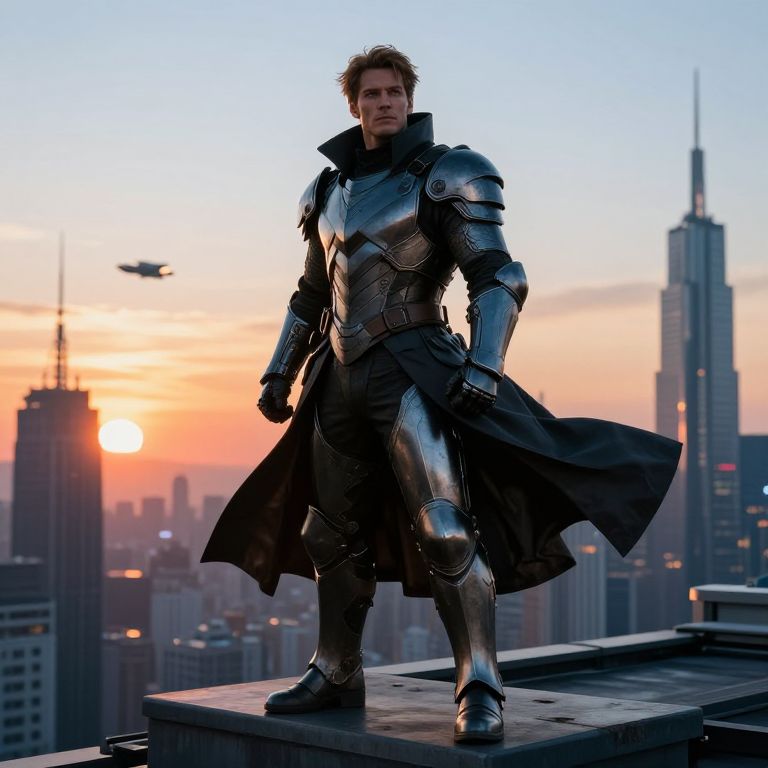Heroic figure in an armored trench coat standing on skyscraper rooftop at sunset, coat billowing in the wind, intricate plating combined with flowing fabric, futuristic city skyline with flying vehicles in the background, cinematic composition with warm and cool color balance.