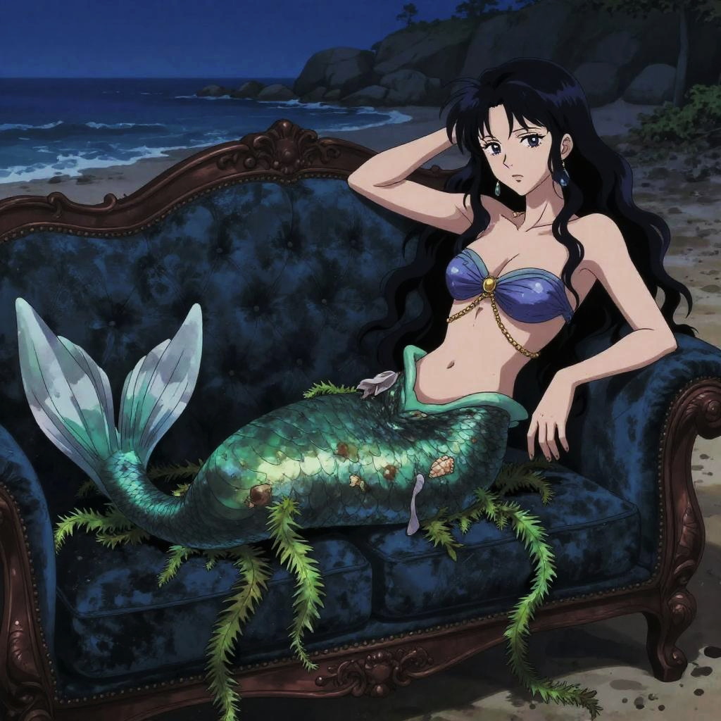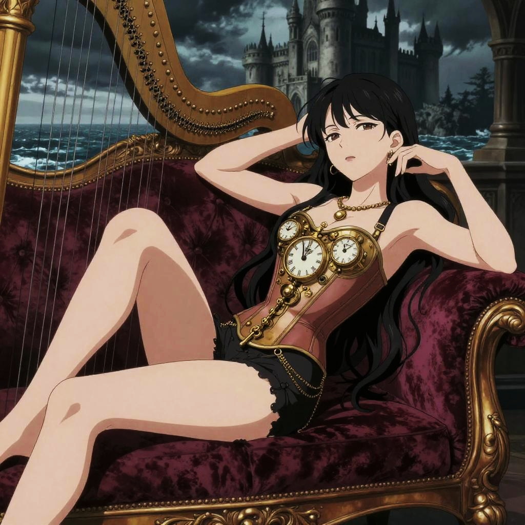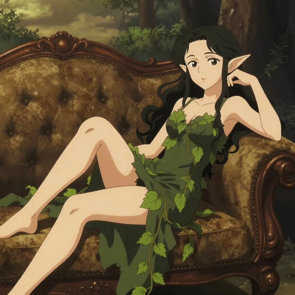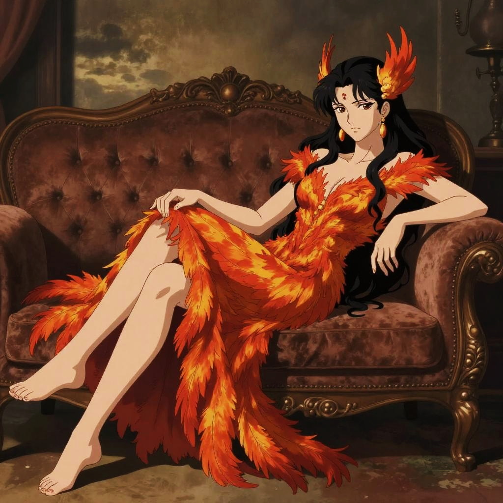 Ecchi art of phoenix maiden reclining seductively on a luxurious velvet sofa, wearing fiery feathered gown, soft ambient lighting, anime-style with intricate details BREAK cinematic portrait surreal realism style, moody atmospheric lighting, vintage-inspired fashion, muted earth tones, dramatic sky and rural background, painterly detail, mysterious and symbolic composition, editorial aesthetic, fashion meets fantasy tone