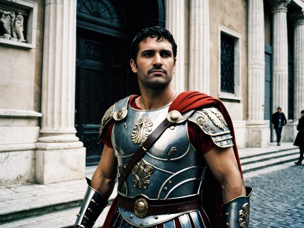 Roman Soldier Fancy Dress face swap, man in a roman costume standing on a cobblestone street