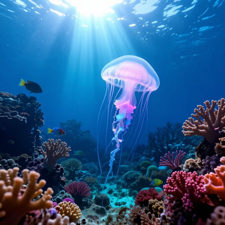 Stable diffusion random prompt depicting an underwater world with colorful coral reefs, diverse marine life including glowing jellyfish, sun rays filtering through water, ethereal ambiance, vivid colors, highly detailed, fantasy nature scene