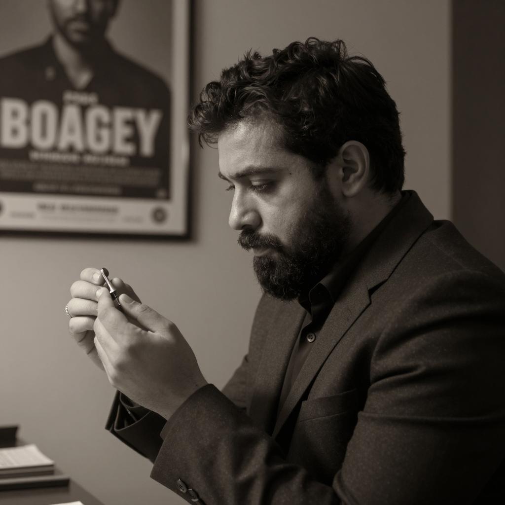 Photograph of a man with dark hair and a beard, wearing a dark suit, holding a small object in his right hand, examining it closely. Dimly lit room, poster on the wall, blurred background. Monochromatic sepia tone.