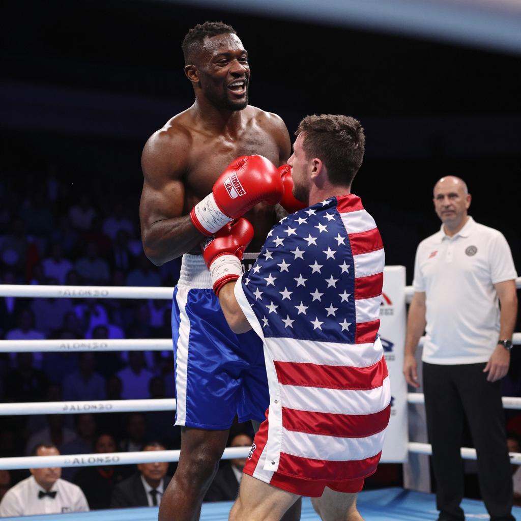 Photograph of a boxing match. Black boxer with muscular build, wearing red gloves, being lifted by another boxer. Lifted boxer has medium build, dark hair, draped in American flag. Background includes dark audience, ring ropes, and trainers. Lifted boxer's face shows intense joy. Two trainers in white shirts, one with "ALONSO" visible.